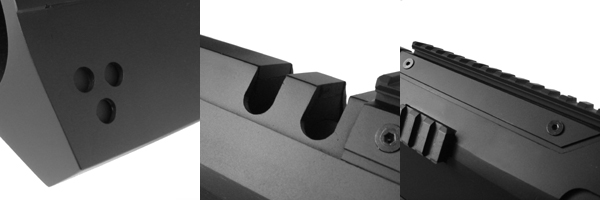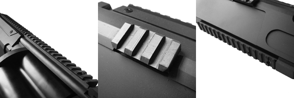 上下にロングサイズ、左右側面にショートサイズの20mmレールが増設されており、レーザーサイトや目視照準可能なドットサイトなどの各種パーツを搭載可能。