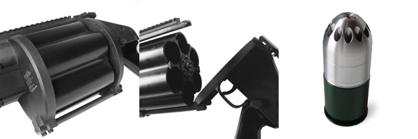 ベースに使用された従来型のリボルバーランチャーの回転弾倉。この部分は無加工と思われる。40mm径のグレネード弾を6発、セミオートで発射可能。 ○ベースそのまま、無加工です。