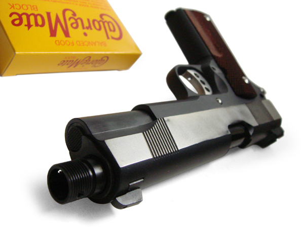 また、グリップパネルの側面はスネーク自らが削って加工した。これは“CQC”でナイフを持ったままハンドガンを構える為で、このカスタムによってしっかりとナイフごと握りこめるよう改良されている。メインスプリングハウジングは、より握りこむためにフラットタイプにしてある。マガジンはガバ純正弾倉、.45ACP弾7発を装填する。