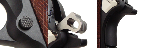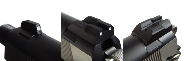 フロントサイトは大型で、視認性が非常に高い。リアサイトは固定式だが、現在でいう「コンバットタイプ」で瞬間的に標的を捉えやすい実戦的な形状。当時としてはかなり先進的なスタイルだった。