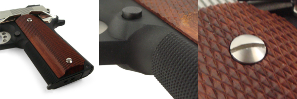 “フロントストラップ部分には手に食いつくようなチェッカリングが施してあり、滑ることはまず無い。トリガーガードの付け根を削りこんであるから、ハイグリップで握りこめる。”