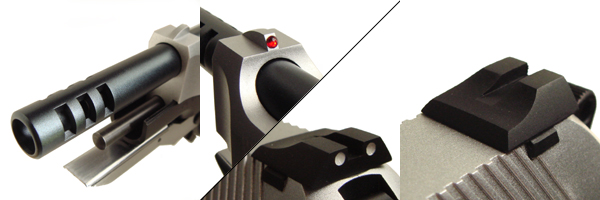フロントはスライド一体型サイトに半球形・クリアレッドのドットを埋め込み、リアはホワイトドットの入ったタクティカルタイプに交換されている。フロントの赤ドットはシルバーのスライド上でも目立ち、視認性に優れる。 ○フロントは赤いアクリルビーズを貼り付け。リアはベーススライドと一体型だった部分を削り落として、プラ材削り出しのオリジナル製作」パーツを追加しました。