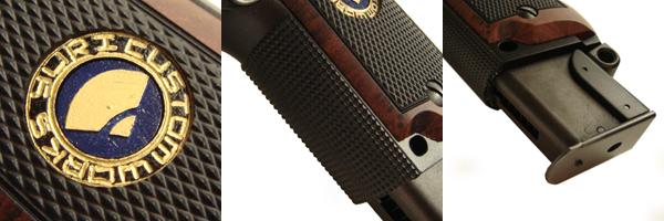メダリオンは樹脂板積層でオリジナル製作。マガジンキャッチボタンはベースパーツを磨いてクリアコーティングしています。