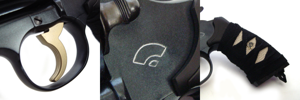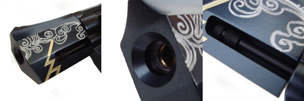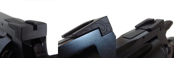 回転式拳銃では通常、前後左右に微調整可能で精密射撃向きの「可変式」リアサイトが一般的であったが、居合い撃ちによる衝撃や近距離での瞬間的照準のために大型固定式に変更されている。実戦主体のパーツだが側面には控えめに雲の模様も彫り込まれており、洒落っ気も忘れていない。