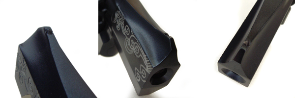 フレームから流れるようなラインで造形され、収納・抜き撃ちの動作中に鞘内部で極力引っかからないよう工夫されている。