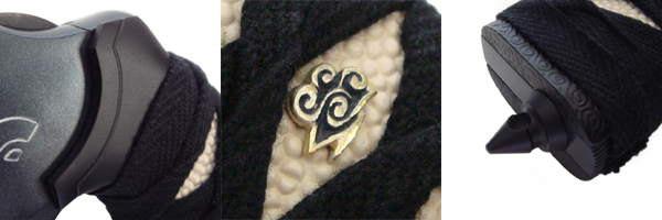 形状には工夫があり、振った際の遠心力で手からすっぽ抜けないよう末広がりの形状になっている。両側面には「雲と雷」を模した金の目貫飾り。グリップ底部にも雲のような渦巻き模様が細かく彫り込まれており、先端には穴の開いたスパイク状の金具が取り付けられている。この金具には根付紐などを通せるほか、超接近戦で打突攻撃に使用したり、鞘に収めた状態で銃を抜く方向を決める「予備照準」にも使われる。