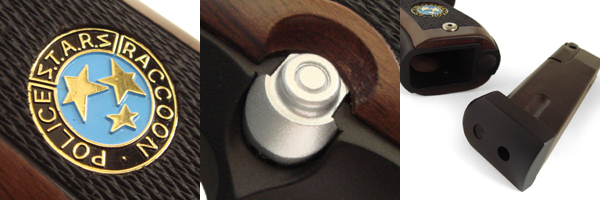 木製グリップパネルベースで中央に黒いラバーコーティングを施した“ハイブリッドタイプ”グリップ。サムライエッジと同じく左右両側面にS.T.A.R.S.のメダリオンが埋め込まれており、レギュラーメンバーであるジルの専用メダリオン(黒い縁取りに中央がライトブルー)が使用されている。グリップスクリューはステンレス製のヘキサゴンタイプスクリュー。