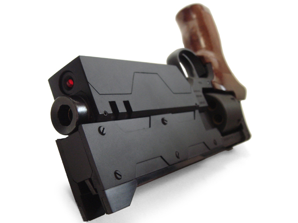 ○ベースのバレルにプラ材を追加してオリジナル製作。なんか“パカッと割れて隠された機能とかが発動しそう”な意味深なデザインにしましたw 先端のガスポートはバレルを直接貫通はしていませんが、穴の奥にフィルターのようなカバーを取り付けて、いかにもガスが抜けそうな造形表現をしています。