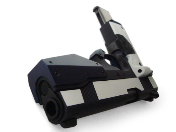ハルの銃としての一番の特徴で、大幅にボリュームアップされている。スライド下部までもしっかり守るよう前方へ伸びた形状で、トリガーガードまで覆っているため、仮に銃を握ったまま相手をぶん殴っても壊れにくい。鉄塊とも言える重量だが、ハルは問題なく使用している模様。