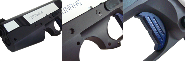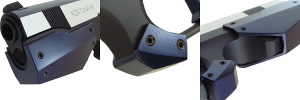 .強化素材のフロントセレーション入りスライド。FORTUNAの銘以外に刻印は一切ない。スライドの刻印は、いずれハルが帰って銃を左利き用に改造する(排莢口を左側に開ける)スペースを確保するため、前方寄りに刻んである。