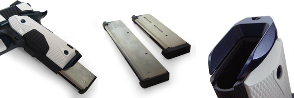 晴正がハルに渡したのは.45ACP弾10発装填のロングタイプとノーマル7発マガジンの二種類。メインはロングマガジンを使用し、ノーマルマガジンは予備として携行できる。グリップ底部にはマグウェルが装備されていて、手元を見ずにある程度の感覚だけでマガジンチェンジしやすくなっている。