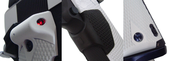 ○海外メーカーのレーザー内臓グリップに交換。実際にレーザー光点を照射できます。仕上げは艶消し白塗装。何気にグリップスクリューもSlexスクリュー(マイナスドライバー&六角レンチの両方使用可能なネジ)に交換してあります。