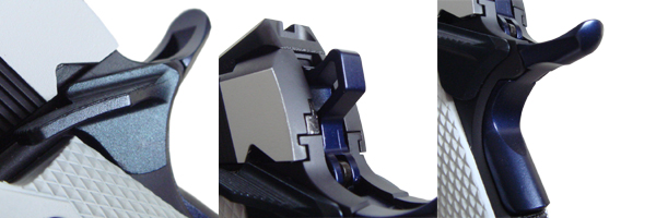 ○サムセイフティは純正品をブルースチール塗装。ハンマーはハイキャパ、グリップセイフティはストライクウォーリアのインデックスドセイフティに交換して、実際に機能をキャンセルしました。