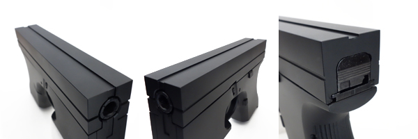 ○ベースのマルイ純正バレルに溝入れ加工しました。スライド正面とツライチになるように先端を少し削って面出ししてあります。また、トイガンとしてブローバックアクションとともに「通常分解」もできるように製作しました。バレル下のフレーム正面はパネル(右写真:スライド後退時に突き出ている板状の部分→)式になっており、これを上にスライドさせて取り外すことで、通常グロックと同じくスライドを前方にずらして通常分解できます。
