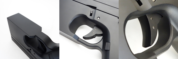 発射スイッチ。トリガープル(引きの重さ)は個人データとして調整可能。 ○シンプルな形状がご希望でしたので、純正のトリガーセイフティ部分をキャンセル加工して埋めました。