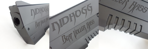 .50口径/.500S&W弾の強烈な反動に耐えるヘヴィバレル。過剰なほどに装甲化されており、その重量によって発射衝撃を相殺するバレルウェイトとしての機能もある。また、底部には放熱のためと思われるフィン形状も備えており、激しい連射による加熱にも強い。左面には銘の“NIDHOGG(ニーズヘッグ)”と“BEAT VOLLER HASS”の文字が刻印されている。