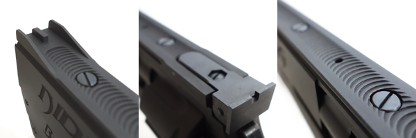 フロントはウイングプロテクター付き強化サイト。リアはアジャスタブルサイトで左右上下に微調整可能。前後をつなぐリブには乱反射防止のためのスリット加工が施されている。