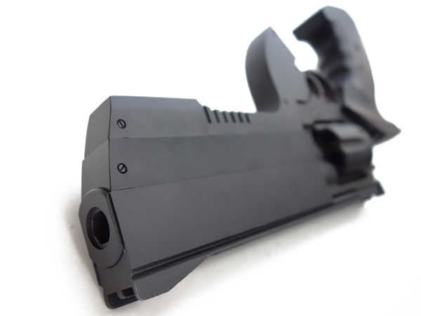 >○プラ板で加工した追加パーツをベースの『コンストリクター』のスクエアバレルに増設して製作しました。トリガーを覆う円形プロテクターは、ご依頼主様が過去作ブラッディナンバーを気に入ってくださって、それを踏襲しています。刻印は外注でレーザー彫りをお願いしたので、非常に美しい仕上がりです(´ω`)