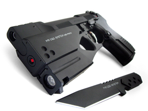 同様にレーザーサイト及びフラッシュライトの専用ユニットが装着できるセットで、色は「黒色をメインに青色のワンポイント」とのことでした。