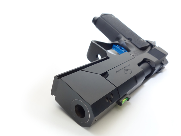 マズルには.グリップセイフティはキャンセル加工されており、コック&ロック(いつでも発射できる状態でサムセイフティだけON)さえしてあれば、たとえ不意の遭遇戦で不自然な角度で銃を握ってしまっても確実に発砲できる仕様。