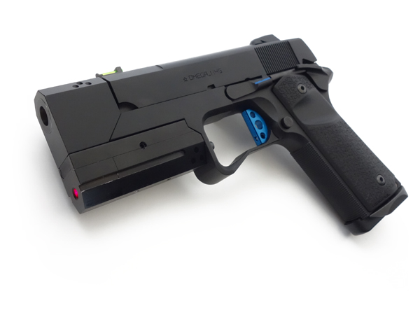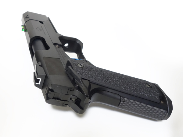 コンパクトなデトニクスタイプ・スライドに、オーソドックスな1911系のフレームをベースとして組み上げられたこのカスタムは、ショートスライドによる高い連射力とノーマルマガジンによる必要最低限の装弾数を両立している。
