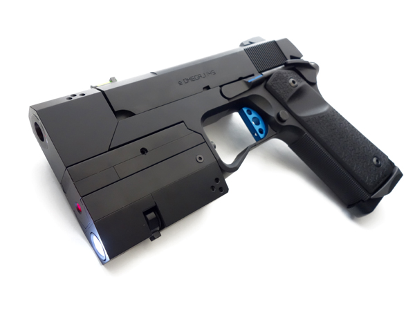 .45口径、コンパクトでありながら充分な威力を持つ専用拳銃。ユニット化されたレーザーサイトとフラッシュライトを装着でき、携行性を損ねることなくどんな状況にも対応できる最後の切り札。