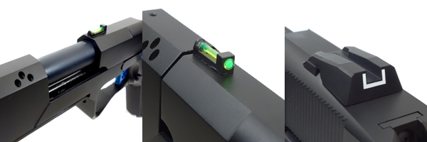 フロントは集光樹脂を使用したタクティカルサイト。リアは固定式コンバットサイトで角処理が施されている。 ○元のフロントサイトを削り取り、フリーダムアート製グロック用集光サイトを取り付け加工しました。リアサイトも実際に角を面取り加工しています。