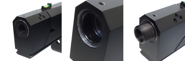 ○オリジナルデザインのコンペセイターを、外注加工(アルミ削り出し)で製作してもらいました。内部に先のノンリコイルアウターバレルを差し込めるように設計して、14mm正ネジ/14mm逆ネジのアタッチメントスクリューも装着できるようになっています。ガスホールはダミーで、アウターバレルには穴が開いていないので実際の機能はありません(´ー`)