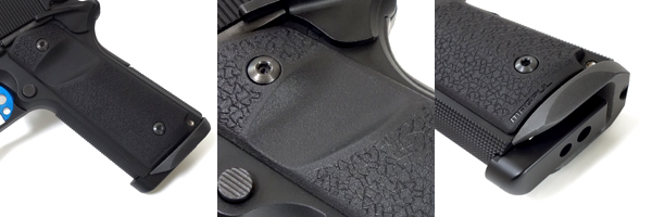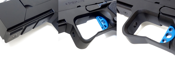 溝が彫られ青いラインが入ったスライドストップ。この青色は第132戦術航空隊のチームカラーで、万一銃が手元から飛ばされても発見しやすくする為の目印としても機能する。 ○ベース純正パーツに溝彫り加工後、メタリックブルーで色入れしました。