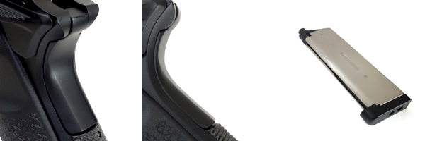 ○ベース純正グリップセイフティーを切削加工しました。ボルトをねじ込んでキャンセル加工したあとテール部分を切り外して、メインスプリングハウジングと自然に繋がるようにカーブを整えながら削り込んでいます。これで実際にハイグリップしやすくなり、スイッチングの際にもテールの突起がないのでグロックなどに近い感覚でスイッチングできます。