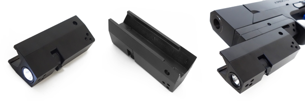 ○市販の小型フラッシュライトをアルミ削り出しのオリジナル外装に内蔵しました。レーザーユニットの横溝に沿って装着できます。特にこの装着のための寸法調整と設計が大変でした(;´Д`)
