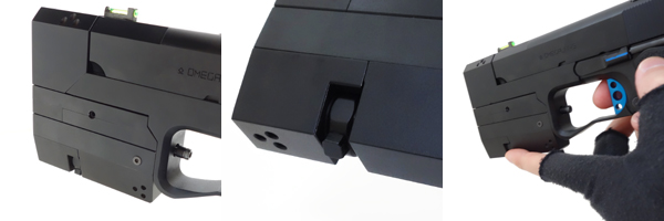 フレーム下部には専用レーザーユニットを装着する為、20mmレイルが取り付けられている(もちろん同規格の各種アタッチメントも装着できるが、本作戦では想定されていない)。トリガーガードはグローブ装着でも確実に操作できるよう、大きく拡張された独自形状。前面の幅がフレーム幅と同じくらい広く、これによって2種類の専用光学ユニットをがっちり固定できるよう設計されている。この幅広形状は、閉所での不意の遭遇戦で特に被弾しやすい指の保護も兼ねている。