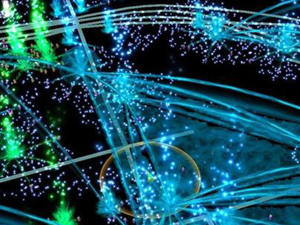 ビジュアル的なイメージは青と緑の光のライン。ポイントとポイントを結ぶ幾何学模様がサイバーチックなネットワーク感を感じさせるデザイン的要素。