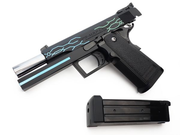 実銃モチーフはおそらくSTI(Science Technolgy Ingenuity)社製のガバメントモデル。世界スピード射撃選手権者のチップ・マコーミックと共同開発したコンバットシューティング・ガンで、スティール製レシーバーとポリマー製グリップを一体化させ、軽量化と高強度性を合わせ持つ多弾倉フレームを搭載した「現代的戦闘銃」です。