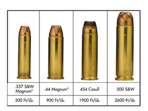 代表的なマグナム拳銃用弾薬の比較画像。…まあ、現役最高威力の500S&Wが如何に規格外か、が一番目立っちゃってますね(;´Д`)