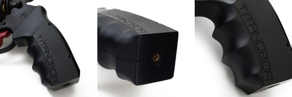 衝撃を緩和する特殊樹脂製で、このカスタムの為に製作された特注品。しっかりと保持するためフィンガーチャネル付き、側面に「TITANOBOA」の銘が彫り込まれている。