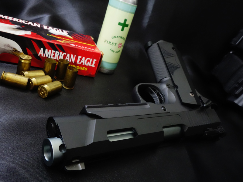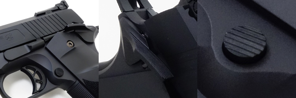 ほぼ常にコック&ロック状態で携帯するため、ハンマーはリアスレスタイプ。 ○社外品のハイキャパ用ハンマーに交換。