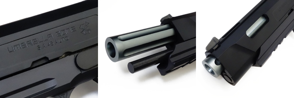 独自の強化&軽量化スライド。左面にUMBRELLA BONEの銘と崩壊するアンブレラマークが刻印されている。 ○社外品のハイキャパ用スライドに交換。側面の刻印をいったん埋めて、オリジナルの刻印を彫り直しました。バラバラに分解していくアンブレラロゴはオリジナルデザインですが、結構気に入ってます(´∀`)