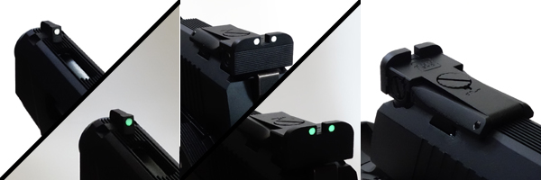 3ドットタイプのアイアンサイト。リアはボーマータイプの可変式サイトを削り込んでスムーズに加工してある。白ドットは薄暗い環境下でも光って見える夜光式で、対B.O.W戦に対応している。