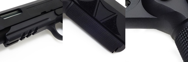レイル一体型のフレーム。各種光学装備が装着できる。トリガーガード付け根はハイグリップの為に削り込まれ、グリップ前部にはチェッカリングが施されている。