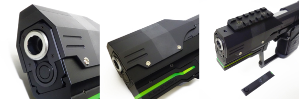 ○プラ素材でオリジナル製作。M6系ハンドガンのデザインを参考に、スライドを保護するようなプロテクター形状にしました。また、プロテクター上部を六角ネジで取り外せば20mmレイルを装着してダットサイトやスコープを乗せることも可能。これはモエガミ氏にも現物をお渡しするまで秘密にしていたサプライズ機能でしたw