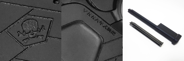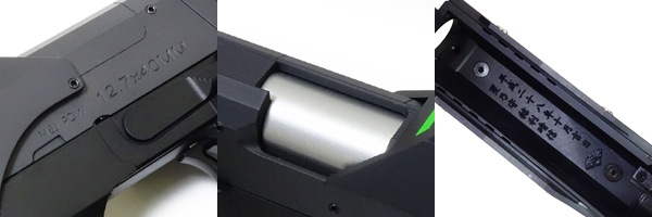 プロテクターと同素材のスライド。側面には型番と使用弾薬規格、内部には製作した職人によって銃の完成時期と真銘が刻印されている。 ○基本ベース品そのままですが、一部に筋彫りやビス留めを追加してディティール情報量を増しています。内部の日本刀風の銘彫り(刀だと茎(なかご)に彫る)はモエガミ氏たってのご希望で、私が真銘を名付けて彫り込ませて頂きました。