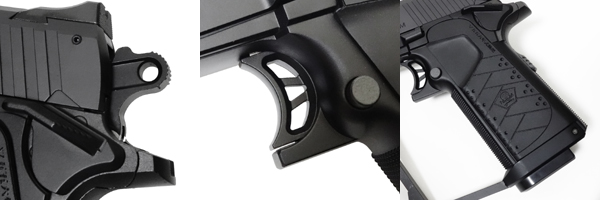 ○ハンマー、トリガーは基本的にベース品そのまま。もとはシルバー色ですが、マットブラックに塗装仕上げしています。また、M6ピストルっぽくトリガーガードは切除してナックルガード内を大きく拡げてあります。