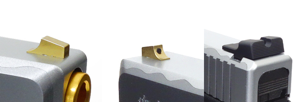 フロントは和風っぽく曲面を取り入れたオリジナル形状のフロントサイト。リアは市販の「10-8」タイプのカスタムパーツを使用しました。
