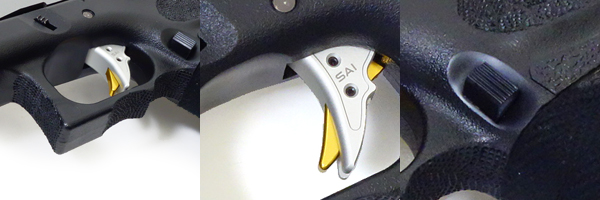 トリガー本体はシルバーで、セイフティ部分は金色をチョイスしました。シルバーのカーブトリガー形状は、この部分単体でも湾曲した「刃」っぽいイメージを無意識に感じられるように選んでいます。