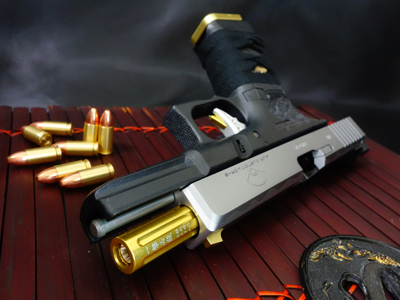 アウターバレルはゴールドアルマイト仕上げの金色。バレル先端にはスライドオープンすると現れる「一撃必殺 結利晴信カスタム」の隠し刻印を彫ってありますw