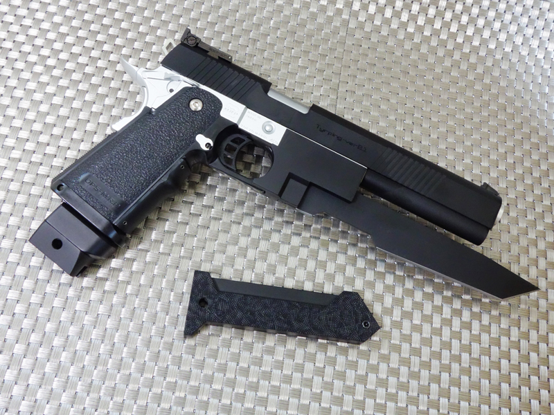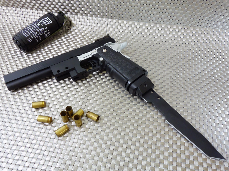 実銃モチーフはおそらくSTI(Science Technolgy Ingenuity)社製のガバメントモデル。世界スピード射撃選手権者のチップ・マコーミックと共同開発したコンバットシューティング・ガンで、スティール製レシーバーとポリマー製グリップを一体化させ、軽量化と高強度性を合わせ持つ多弾倉フレームを搭載した「現代的戦闘銃」です。