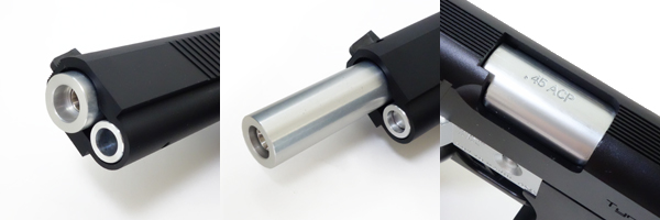 ステンレス製の7インチバレル。口径は.45口径で、威力と命中精度を兼ね備えたロングバレルが選ばれた。