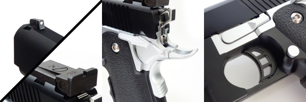 ホワイトドット入りのフロントと前後左右に調整可能なアジャスタブルリアサイト。 ○ベース品そのまま。