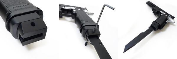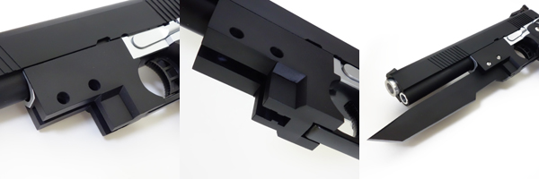 ナイフから取り外したブレードをマガジン下に取り付けるアダプター。フレームと同じくレールに沿って差し込んでボルトで固定。マガジン下(=グリップ下)のブレードは、高速移動しつつ追い越しざまに相手の首を掻き切るなど、ピンポイントでの暗殺のような攻撃に向く。